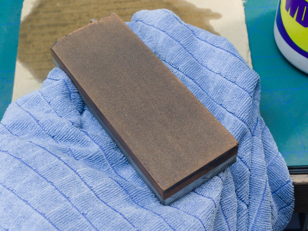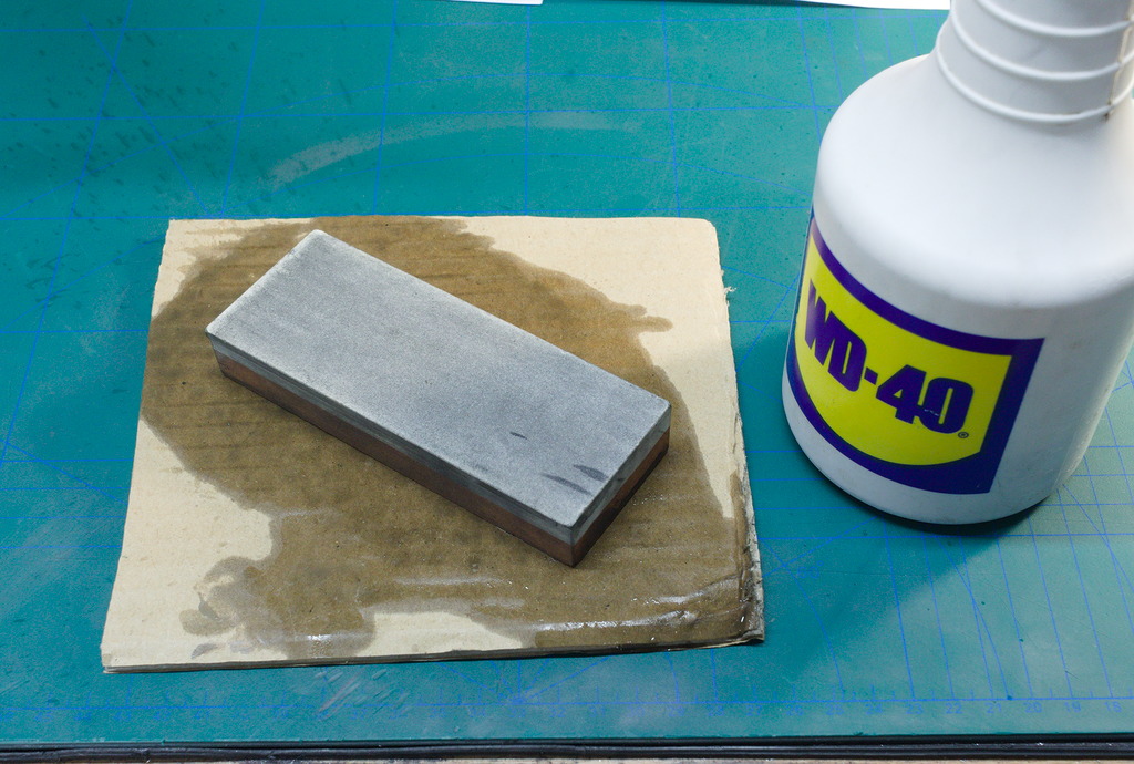 Anschließend die Steine mit Pressluft abblasen oder mit einem Fusselfreien Tuch trocknen, im Anschluss sind die Steine wieder Einsatzbereit.Reinigen eines Abziehsteines auf mit WD40 eingesprühter Pappe Abtrocknen mit einem sauberen Mikrofasertuch - Die Körnung der grauen Seite ist mittel-fein, die weiße Seite fein. Beide Seiten des Abziehsteines erzeugen allerdings nahezu gleichwertige Oberflächen. Es ist daher sinnvoll die graue Seite für „gröbere“ Arbeiten zu verwenden, die weiße Seite für kritische Oberflächen die auf keinen Fall verkratzt werden dürfen.