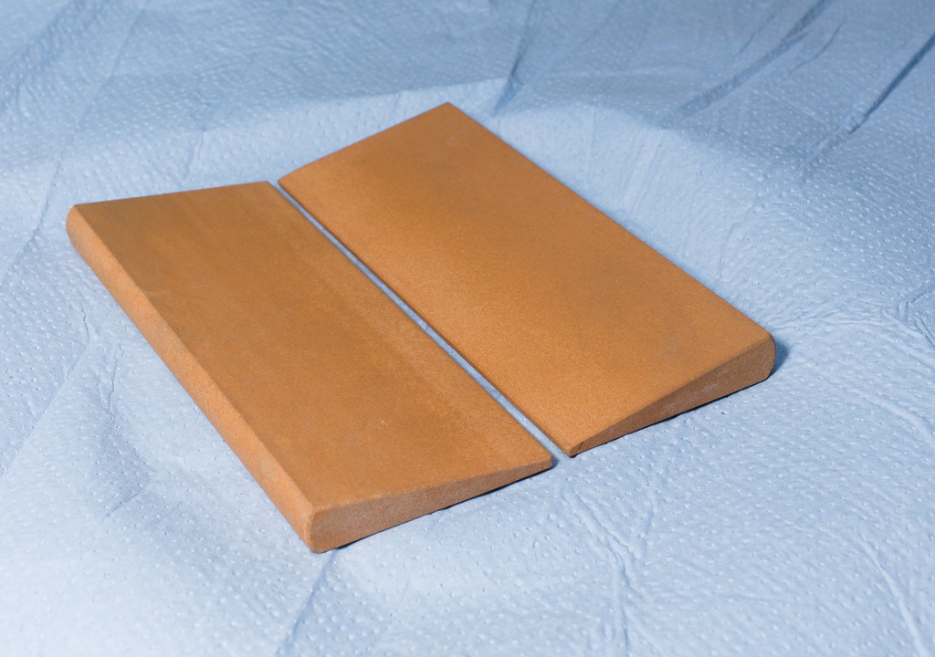 - Vor jeder Anwendung die Steine gegeneinander reiben um eventuell eingebetteten Metallabrieb, der die Oberflächen zerkratzen könnte, abzutragen – Das ist auch der Grund warum diese Steine paarweise geliefert werden. Man spürt am Anfang, direkt nach dem aufeinander setzen der Steine einen Widerstand, wenn man Versucht die Steine gegeneinander zu verschieben. Dieser Widerstand entsteht durch minimal erhabene Schleifkörner, Abrieb, etc. Werden die Steine anschließend aufeinander gerieben, egalisieren sich diese Überstände und der Stein ist Einsatzbereit – Die Steine müssen ohne Widerstand aufeinander gleiten. Dieser Vorgang sollte jedesmal wiederholt werden, bevor einer der Abziehsteine auf einer neuen abzuziehenden Fläche platziert werden soll. Anschließend den Stein auf die zu bearbeitende Fläche aufsetzen und seitlich bewegen, das Vorhandensein von Graten oder aufgeworfenem Material spürt man. Die Fläche so lange bearbeiten, bis der Stein frei auf der Oberfläche gleitet, ggf. Optisch kontrollieren.